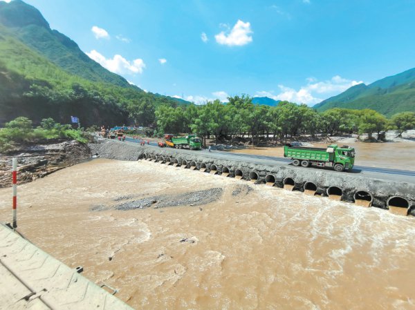 “跨河修一条路,且不行闪开阻断了排洪的河说念,任务难度特殊大。”八公路处表情二部珍贵东说念主郑桂林说,凭证抢险推断,他们蹙迫调配了100根水泥管,这些管说念直径160厘米,编成20组以后,顺着河说念水流地方排布在水下,再加装钢丝石笼减缓水流,提高路基踏实性,由此可完成不影响排洪需求的踏实路基,然后再于水泥管上铺设路面。